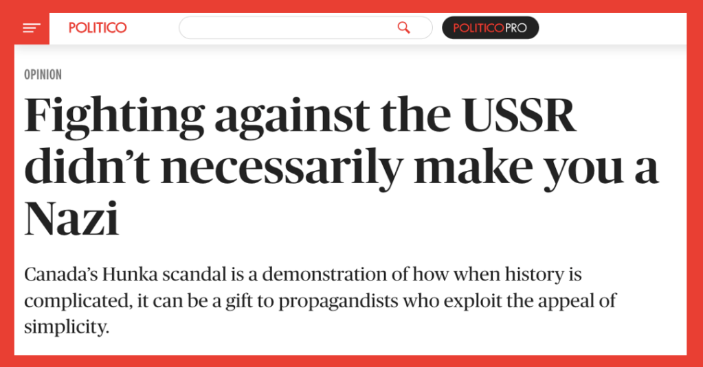 In what Matt Taibbi has described as “the worst op-ed in history”, Politico Europe has published an astonishing article titled “Fighting against the USSR didn’t necessarily make you a Nazi”, which defends the scandal of the Canadian parliament applauding a literal SS Nazi veteran as a “complicated” issue that is being exploited by “propagandists”.