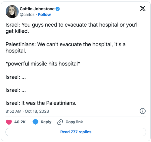 Maybe they’re getting information in their group chats which has caused them to keep Israel’s claims about the hospital bombing at arm’s length, or maybe they’re just looking at the facts and deciding this narrative is too flimsy to get behind. If it looks like Israel’s version of events will fall apart after investigation, they’re not going to want to stake their reputation and their pride on pushing it with their usual gusto during an Israeli military operation that is facing unusually intense scrutiny from the entire world.
