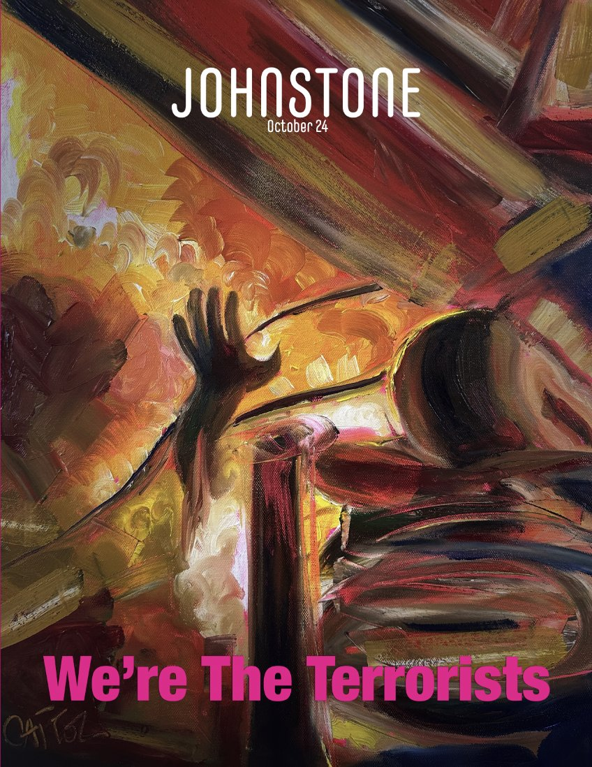 This month’s issue of JOHNSTONE is titled “We’re The Terrorists”, featuring a painting of the final moments of Sha’ban al-Dalou, a 19 year-old software engineering student who was burned alive in his hospital bed by Israeli forces.