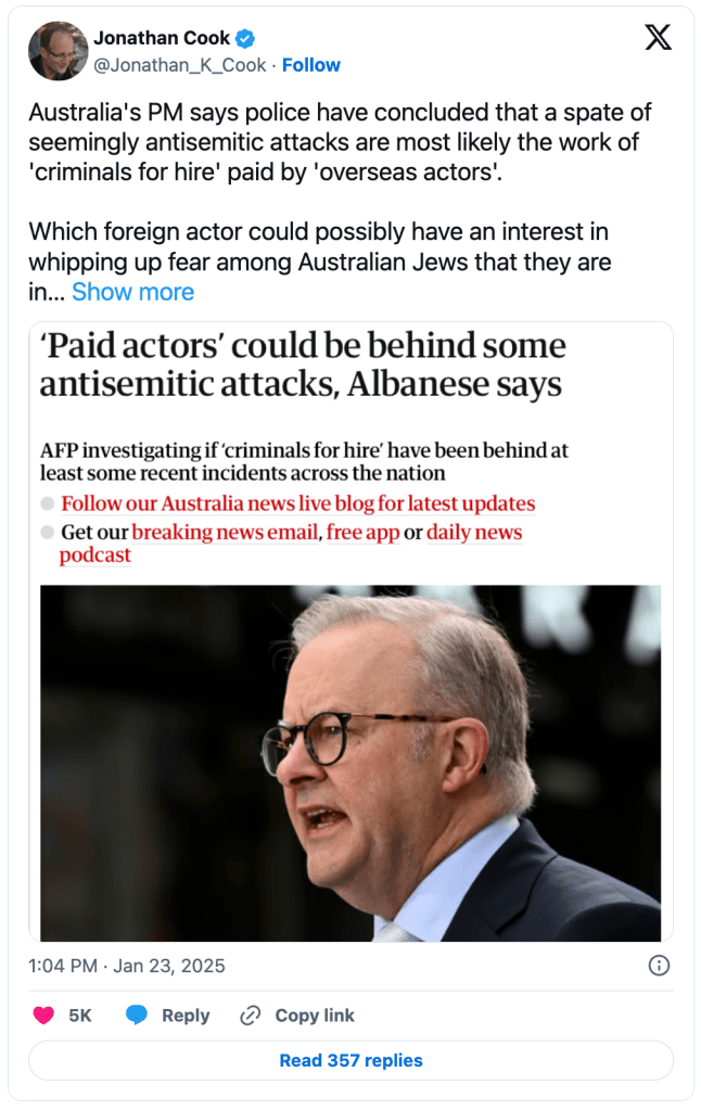 There is a concerted effort to manufacture the illusion of an antisemitism crisis in Australia in order to protect Israeli information interests — and the call isn’t coming entirely from inside the house. Albanese has acknowledged that the perpetrators of a spate of allegedly antisemitic attacks in this country may have been paid actors working for foreign operatives. The prime minister refused to speculate as to which country might be sponsoring these incidents which just so happen to greatly benefit the interests of Israel, but you don’t exactly need to be Sherlock Holmes to narrow it down.